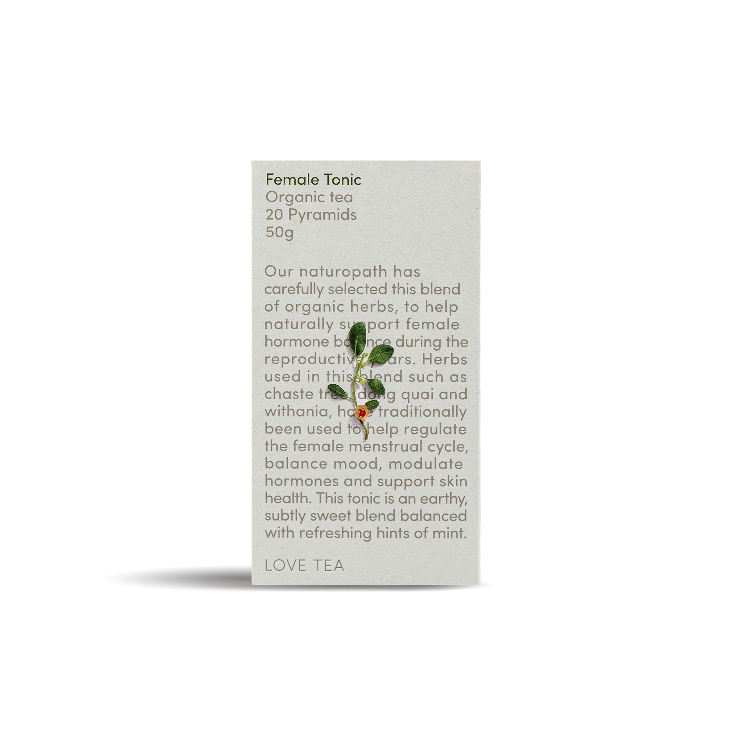 This blend to naturally support female hormone balance through the reproductive years. Herbs used in this blend such as chaste tree, dong quai and withania, have traditionally been used to help regulate the female menstrual cycle, support skin health, balance mood, and modulate hormones. This tonic is an earthy and subtly sweet blend, balanced with refreshing hints of mint. This blend is caffeine free. This blend is not recommended for people with hypertension, those who are pregnant or breastfeeding or those taking the oral contraceptive pill.