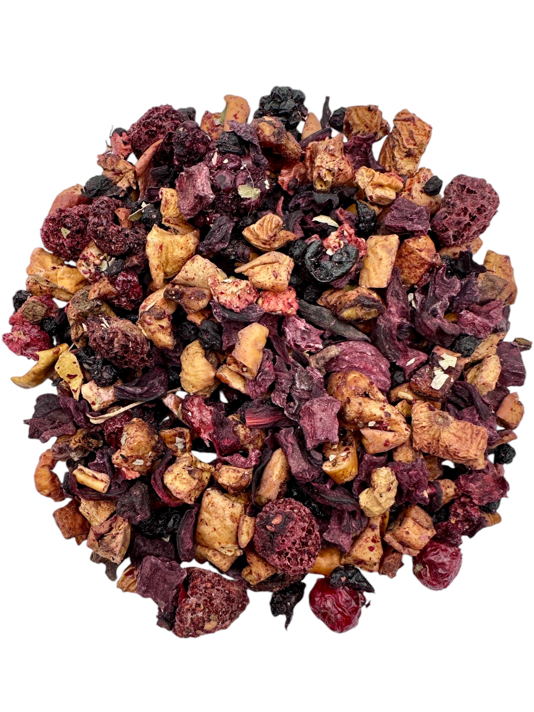 Apple bits, elderberries, beetroot bits, hibiscus, blackberries, black currants, flavour, raspberries, blackberry leaves, strawberry bits, red currants.